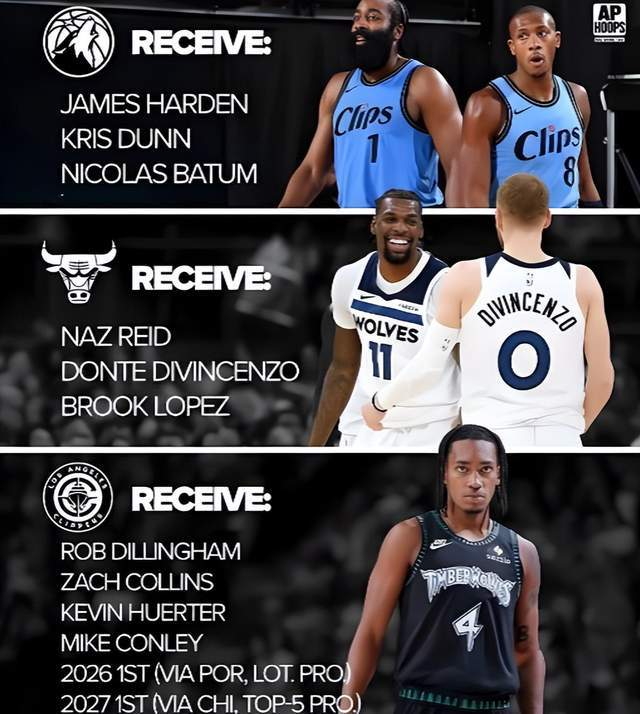 森林狼送出康利+迪林厄姆+里德+英格尔斯,附加2028首轮互换+2030无保护首轮,从快船招募哈登。