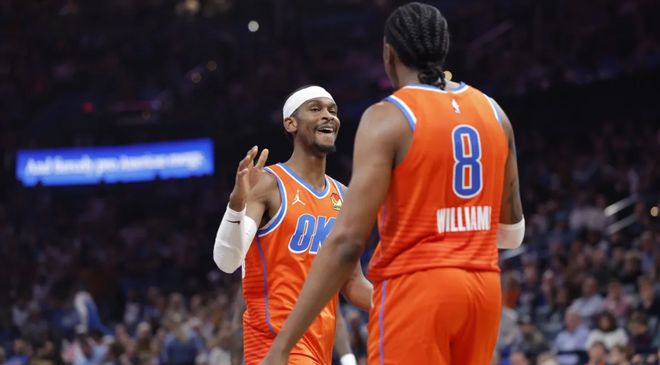 反观雷霆,已展现出联盟独一档的统治力。即便杰伦・威廉姆斯缺席赛季前1/4赛程,球队仍交出20胜1负的恐怖战绩,95.2%的胜率创下NBA近20年赛季前21场最佳开局,提前显露出王朝之师的气质。亚历山大延续了总冠军MVP的巅峰状态,场均32.5分的同时,真实命中率突破65%,突破分球与中距离干拔愈发无解,面对联防时的处理球能力已臻化境。