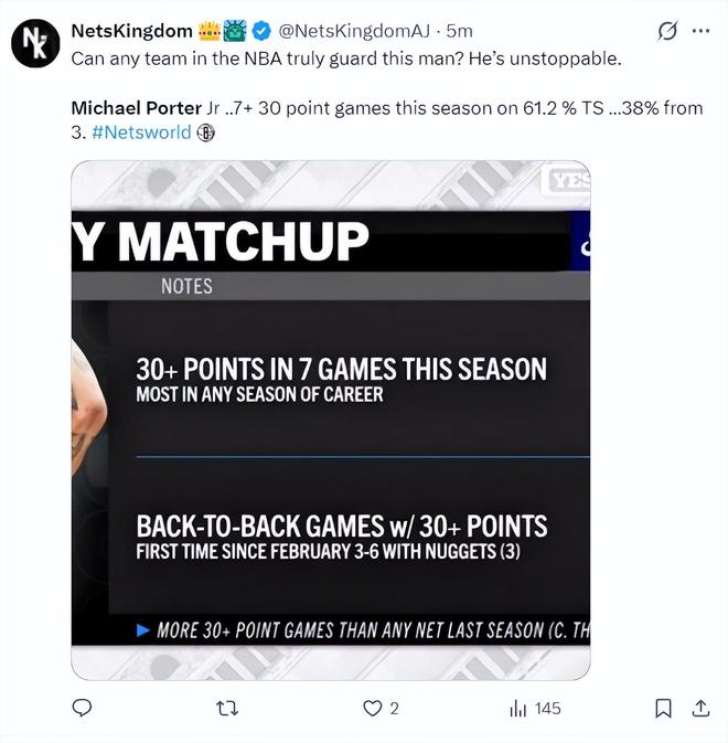 北京时间12月4日,篮网以113-103大胜公牛拿到二连胜。这是篮网本赛季第五场胜利,也是小迈克尔-波特篮网生涯首次连续两场比赛拿到30+的数据,他篮网生涯已经拿到7次30+超过掘金过去两个赛季。