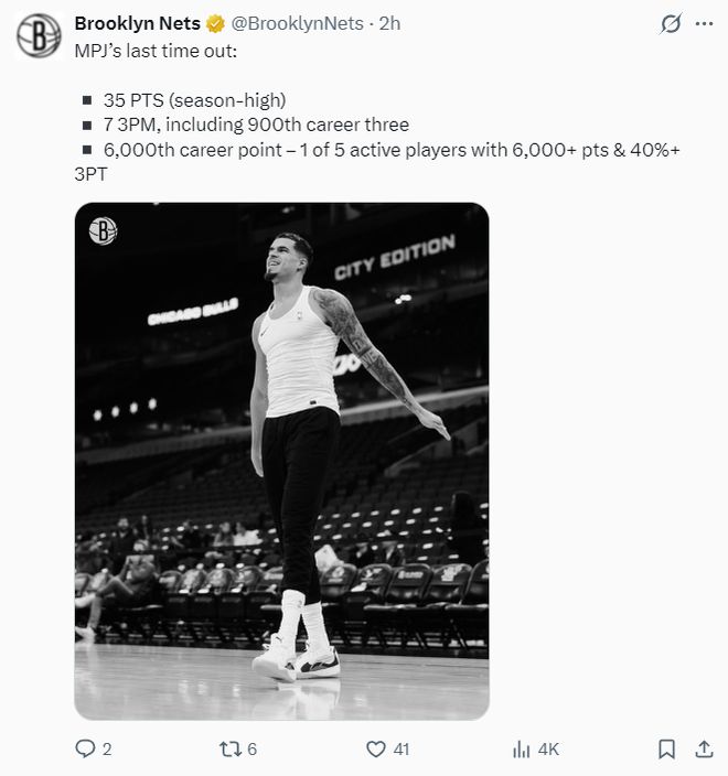 赛前篮网官方就晒出小波特上一场拿到35分(赛季新高),命中7个三分球后生涯完成900+三分大关,生涯总得分超6000+,现役只有5人完成6000分+且三分命中率超过四成。