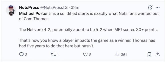 篮网媒体:小波特是一名实力出众的选手,他正是篮网球迷期待的那种球员,当他拿到30+时篮网5胜2负,如果判断一名球员是否是赢球属性就用这项标准评判,你们看看托马斯拿30+时篮网的战绩,他已经用五年时间证明自己没有赢家属性。