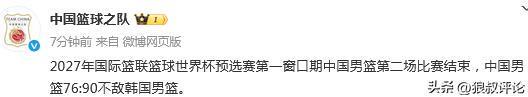 赛后,中国男篮官方社媒更新发文:“2027年国际篮联篮球世界杯预选赛第一窗口期中国男篮第二场比赛结束,中国男篮76:90不敌韩国男篮。 ”