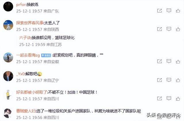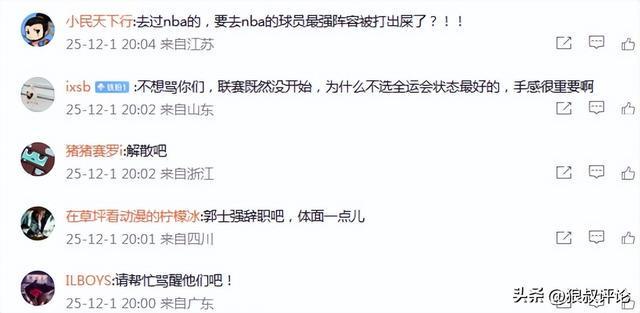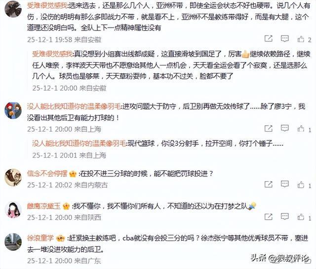 网友“受难很觉感我”点评说道:选来选去,还是那么几个人,亚洲杯带,即使全运会状态不好也硬带。说几个人有伤,没伤的明明有那么多即战力不带,就是看不上,亚洲杯不是教练带得好,而是有大腿,这个道理还没明白吗。全队上下一点精神属性没有。