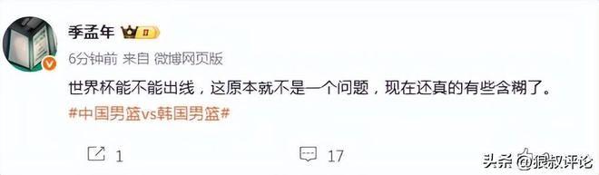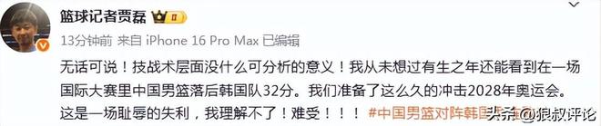 篮球记者“贾磊”发文点评“无话可说!技战术层面没什么可分析的意义!我从未想过有生之年还能看到在一场国际大赛里中国男篮落后韩国队32分。我们准备了这么久的冲击2028年奥运会。这是一场耻辱的失利,我理解不了!难受!”