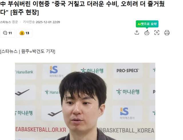 这位韩国球星口气越来越大,非常的傲慢,对于中国队缺少尊重,他表示在看到有赛前分析称韩国男篮能赢中国队一次就算圆满完成任务,他被气炸了。正因为如此,激励他双杀中国队。李贤重还狂言击败中国队并不是他想要的目标:“大韩民国的旅程还没有结束,挫败中国队只是一个开始,我渴望登上更高的舞台。”
