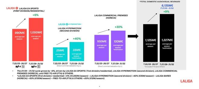 根据新合同,西甲联盟国内视听版权总收入包括:西甲联赛(LALIGA EA SPORTS)付费电视板块收入52.5亿欧元、商业场所(HORECA)板块收入6.5亿欧元、西乙联赛(LALIGA HYPERMOTION)板块收入1.75亿欧元、免费电视及赛事集锦版权收入 6000万欧元。各项收入总计达到61.35亿欧元,这较上一周期增长 9%。